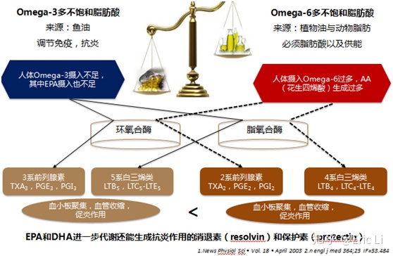 n-3 PUFA與腫瘤預(yù)防的研究始于30年前,但迄今仍存爭議。Brasky TM等認(rèn)為飲食中補(bǔ)充n-3PUFA可以降低乳腺癌的發(fā)病風(fēng)險(HR=0.68,95%CI=0.50-0.92)。2013年一篇由亞太臨床營養(yǎng)學(xué)會(ASIA-PACIFIC Clinical Nutrition Society)營養(yǎng)與食品安全中心聯(lián)合浙江大學(xué)發(fā)表的一篇關(guān)于乳腺癌風(fēng)險與Omega-3攝入的Meta分析4涵蓋了20905例乳腺癌病例,883585位統(tǒng)計自21例獨(dú)立的前瞻性隊列研究的參與者。結(jié)果發(fā)現(xiàn),每日海洋性來源Omega-3補(bǔ)充量越高,乳腺癌發(fā)病率會有所下降(RR~0.86 (95% CI 0.78 to 0.94), I2=54)),根據(jù)劑量-效果分析,每天每增加100mg的Omega-3攝入,能降低5%的乳腺癌風(fēng)險。1982年Chavarro JE等對14916例健康男性的血n-3 PUFA作了為期13年的追蹤,最后476例受試者被診斷為前列腺癌患者,與對照組進(jìn)行匹配后發(fā)現(xiàn)血液n-3 PUFA水平降低者前列腺癌的發(fā)病風(fēng)險增加(RR=0.59,95%CI=0.38-0.93)。Hall MN等對21 406例健康人血n-3 PUFA的濃度作了為期22年的追蹤,最后500例被診斷為結(jié)直腸癌(結(jié)腸癌388例,直腸癌112例),認(rèn)為隨著攝入n-3 PUFA的增多,結(jié)直腸癌的發(fā)病風(fēng)險降低(RR=0.74,95%CI=0.57-0.95)。然而,Butler LM等的一項前瞻性研究提供了相反的證據(jù),1993~1998年共61321例入組,至2005年12月31日,共確診961例結(jié)直腸癌患者,發(fā)現(xiàn)攝入n-3 PUFA飲食增加了Dukes’C或D期結(jié)直腸癌的發(fā)病風(fēng)險(HR=1.33,95%CI=1.05-1.70)。出現(xiàn)矛盾結(jié)論的可能解釋是腫瘤的發(fā)生是多因素相互作用的結(jié)果,包括基因背景、生活方式等。而最新發(fā)表在權(quán)威期刊《GUT》上的一篇研究顯示5,高劑量攝入海洋來源Omega-3多不飽和脂肪酸可以降低結(jié)直腸癌所導(dǎo)致的死亡率,對于確診結(jié)直腸癌患者增加Omega-3攝入意義巨大。
